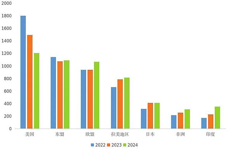 外贸“朋友圈”不断扩容,从欧美主导趋向多元。传统市场整体稳固,2024年对美国进出口1206.98亿元,占全省外贸比重的14.7%;对欧盟进出口1066.3亿元,增长13.3%,其中捷克、意大利等东欧、南欧国家增速飙升,分别达31.1%、20.4%。新兴市场加速开拓,2024年对东盟进出口1091.5亿元,增长1.7%,占全省外贸比重的13.3%,将逐步超越美国成为我省第一大贸易伙伴。“一带一路”与RCEP成新引擎,中东、拉美、北非等地区成为热土。2024年河南与共建“一带一路”国家贸易额3838.7亿元,与RCEP成员国贸易额2402.3亿元。此外,对非洲(308.3亿元,20.1%)、印度(351.69亿元,52.4%)、澳大利亚(248.3亿元,6.5%)、秘鲁(152.8亿元,33.5%)等经济体合作日益深化(见图4)。