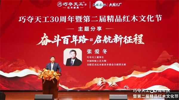 2025年5月10日,第九个中国品牌日以“品牌新力量,品质新生活”的号角,奏响中国制造的奋进强音。作为中国红木行业的标杆企业,三十而立的巧夺天工红木以一场跨越时空的匠心盛宴,向行业昭示:传世精品的锻造,不仅需要时光的淬炼,更需以创新之桨劈波斩浪,以文化之舵锚定航向。这场融汇庆典、智慧与体验的文化盛典,以四大维度诠释了“百年火种”的精神内核,为红木行业树立起一座品质与信仰的灯塔。