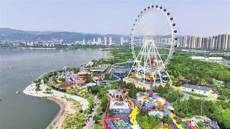 “五一”假期,太原晋阳湖欢乐谷开门迎客,为太原又添一处文旅新地标。晋阳湖欢乐谷游玩项目包含摩天轮、过山车、花果山漂流等。(据《太原日报》张昊5.5)