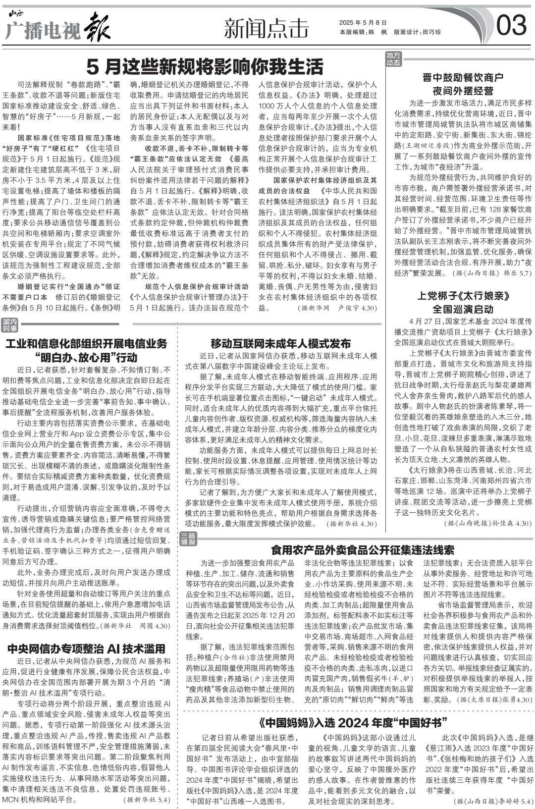 记者了解到,为方便广大家长和未成年人了解使用模式,多家软硬件企业集中发布未成年人模式使用手册,系统介绍模式的主要功能和特色亮点,帮助用户根据自身需求选择各项功能服务,最大限度发挥模式保护效能。(据新华社4.30)
