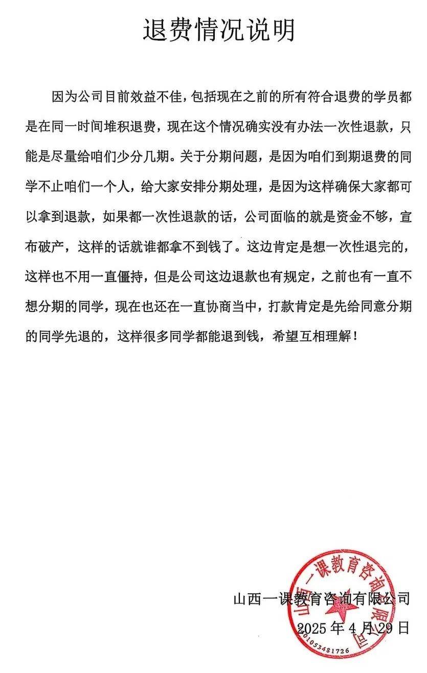 接到投诉后,省消保联迅速行动。4月28日,工作人员致电一课教育,电线日,工作人员前往位于太原市小店区康宁大厦的一课教育实地沟通。该公司相关负责人回应称,目前需退费学生达200余人,因经营不善,无法一次性全额退款,只能采取分期退款方式。其还表示若强制全额退款,公司将面临破产,当前最大让步为减少分期期数,希望消费者予以理解。